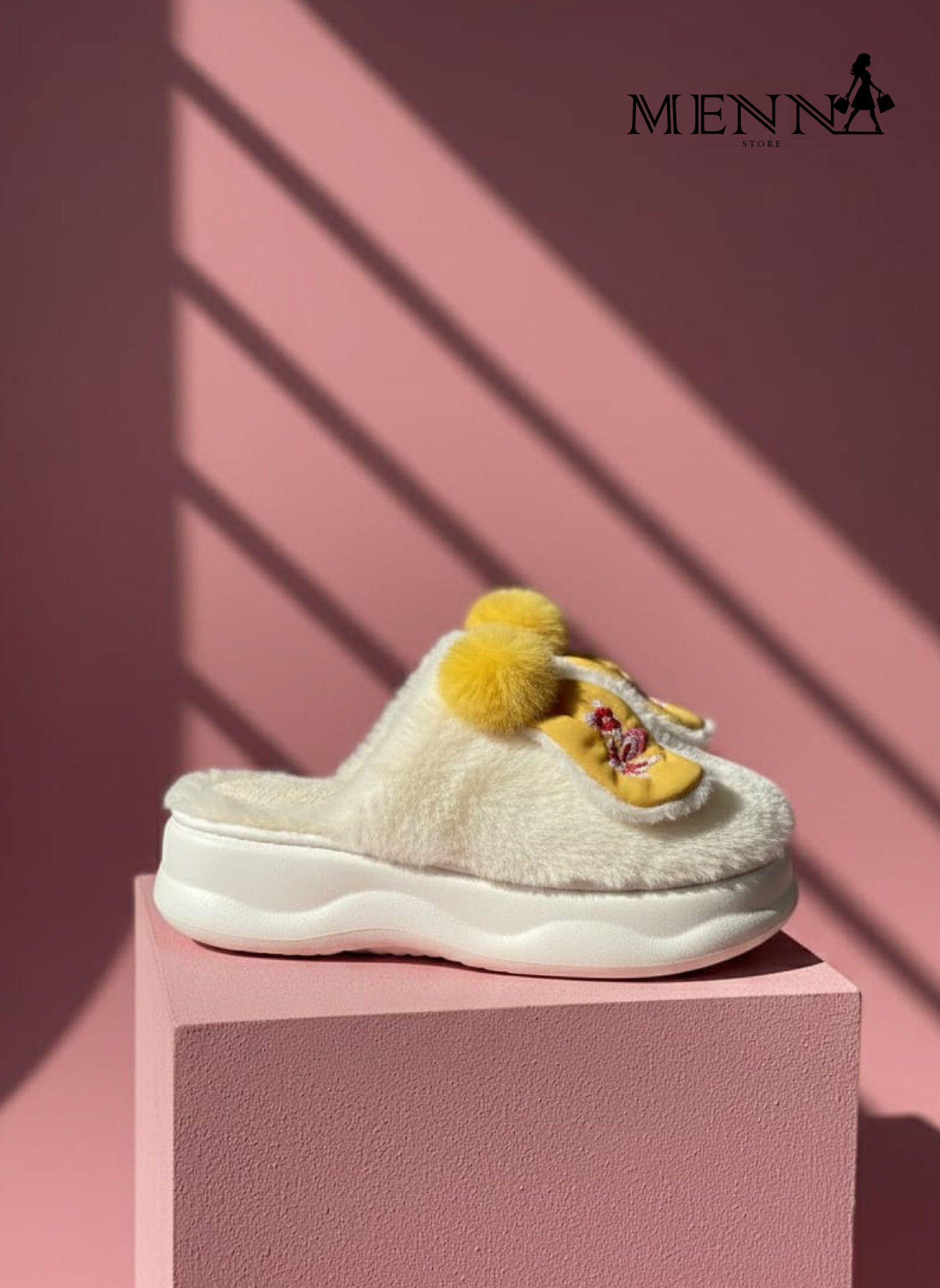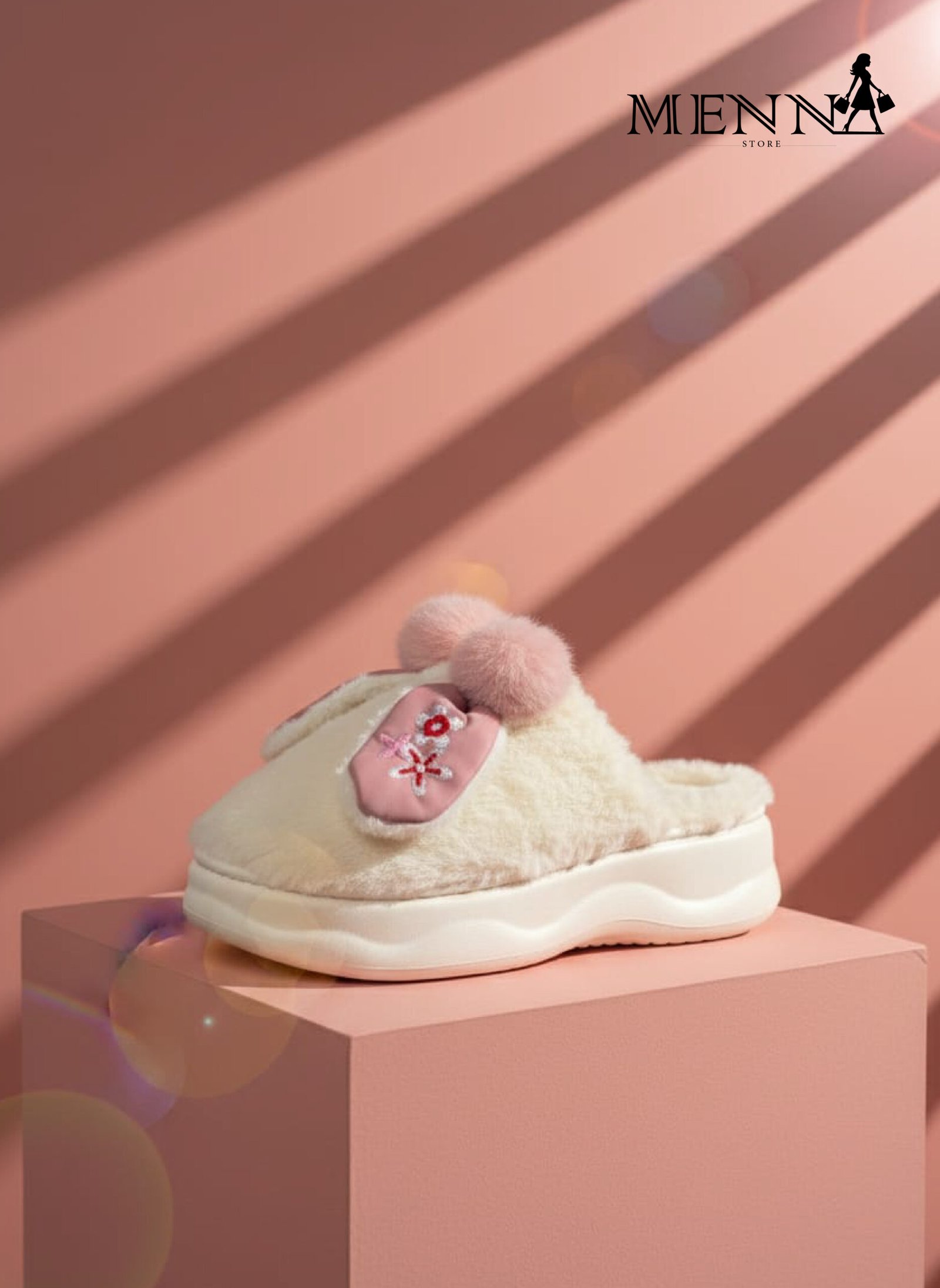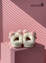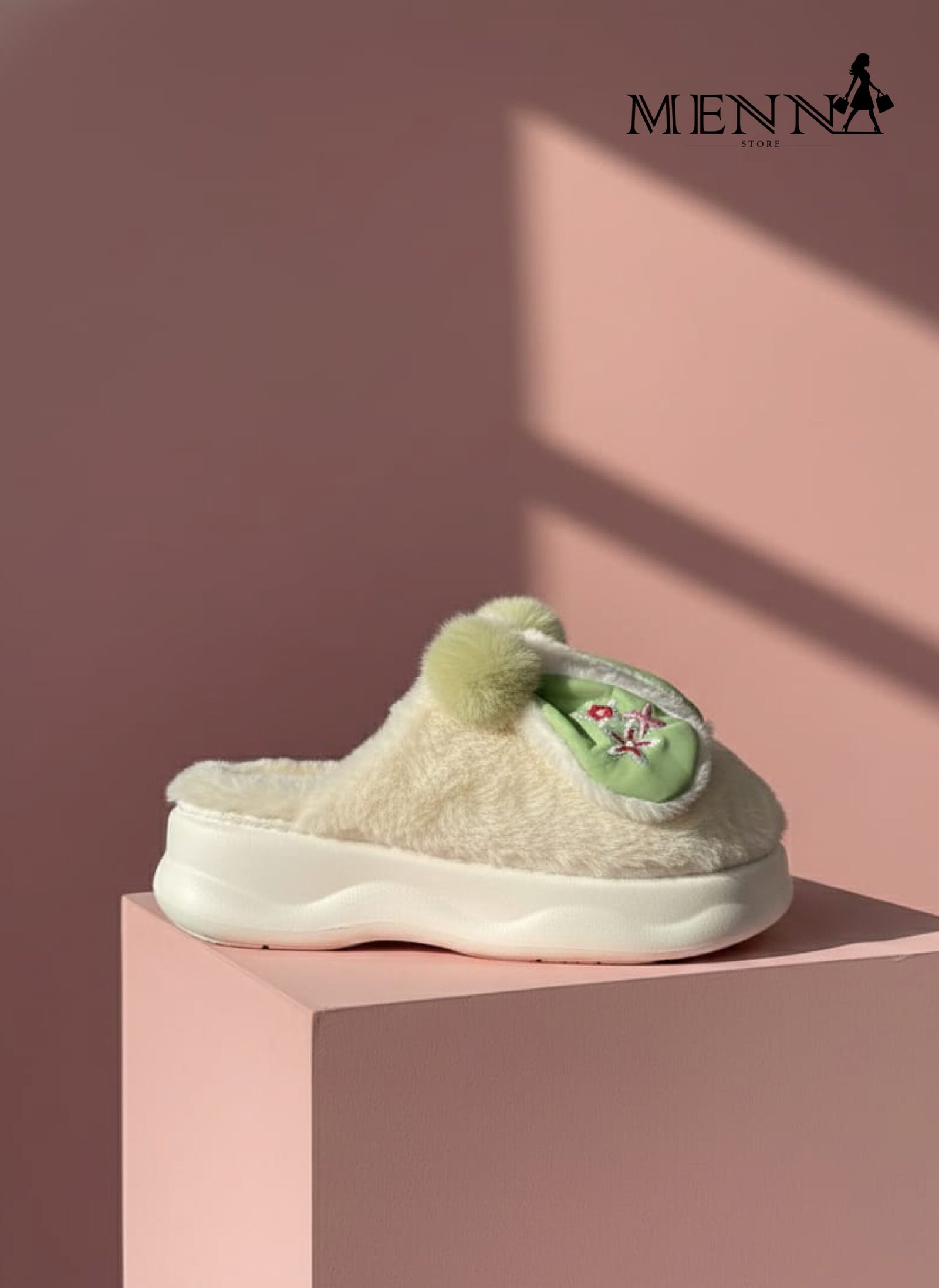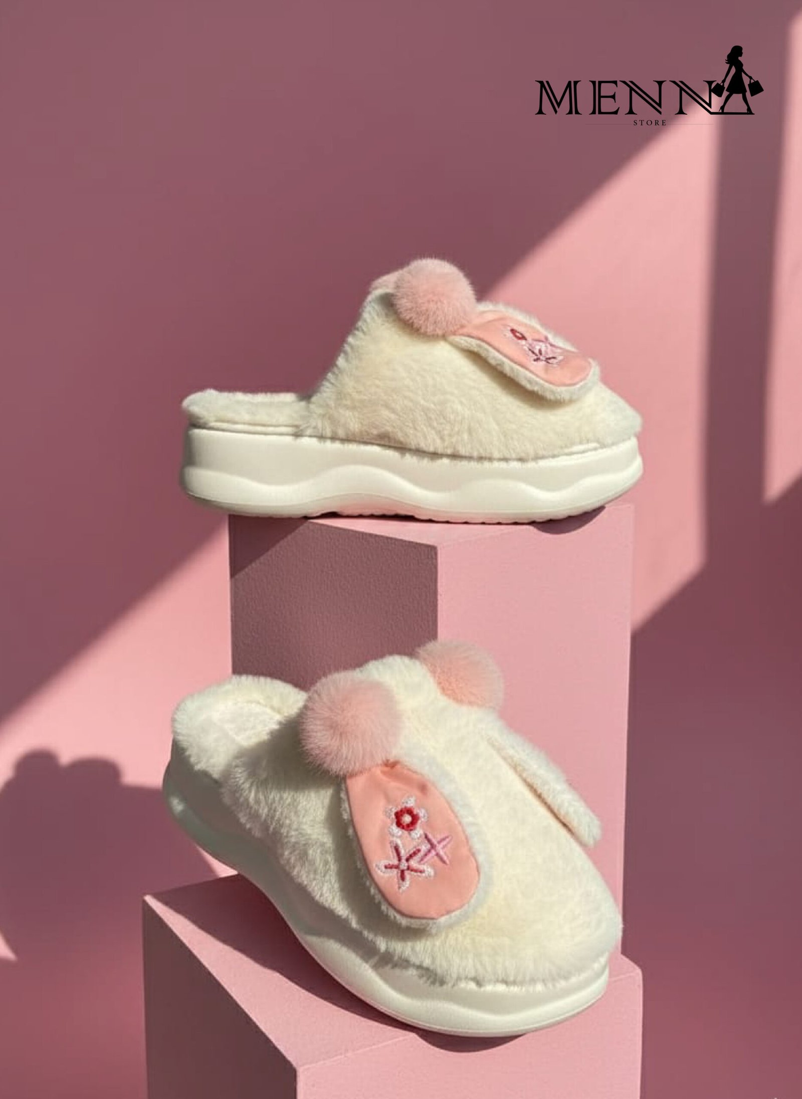 فوت وير حريمي شتوي بخامة فارو ناعمة جدًا بلون أوف وايت هادي، تصميمه كيوت وجذاب بشكل أذن الأرنب وبومبونات ناعمة في الأعلى.
